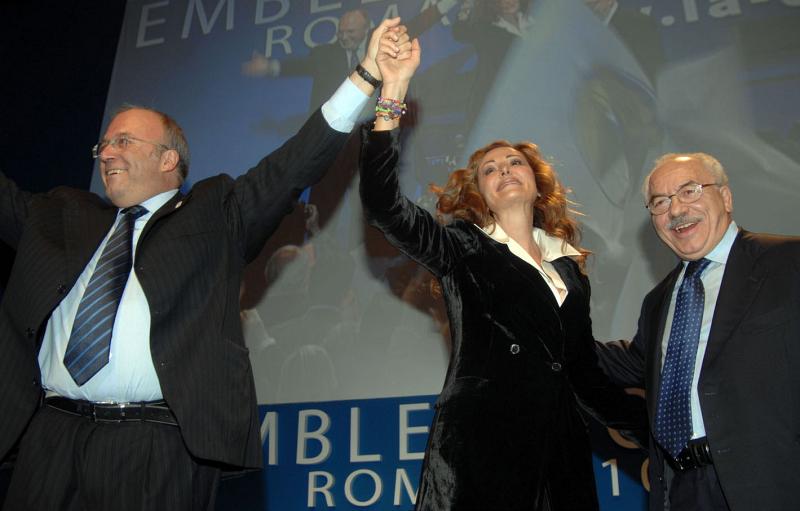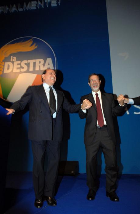 Lui se la coccola con gli occhi mentre lei, in tailleur pantalone gessato blu che maliziosamente scopre per un attimo l'ombelico, arringa il grande salone del palazzo dei Congressi a colpi di «non siamo un partito moderato, siamo un partito incazzato, con la bava alla bocca, che non darà tregua a chi tradisce». Lui è Francesco Storace, raggiante capo del neonato «La Destra», partito che celebra il suo battesimo e che ambisce a raccogliere i delusi di quella che considera la svolta «democristiana » di Fini e i pezzi sparsi di destra estrema che la Cdl già conta. Lei è quella che per lungo tempo i duri e puri di An hanno considerato una che c'entrava poco con loro, una che guidava salotti ma non certo folle: Daniela Santanchè.
